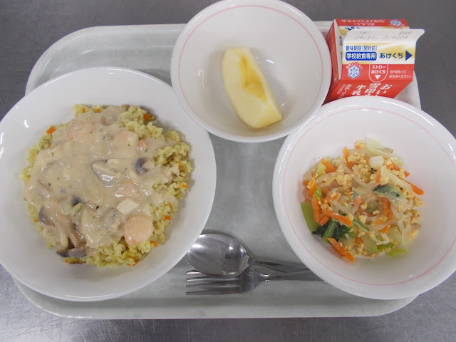 10月21日(月) 日付: 10月 20, 2024 リンクを取得 Facebook × Pinterest メール 他のアプリ <今日の給食>・ホワイトソースピラフ・ミモザサラダ・果物(りんご)今日はごはんにカレー粉を混ぜ、ホワイトソースがかかったホワイトソースピラフを作りました。なんとなくえびクリームライスに近いですが、これはまた違う味わいでご飯が進みます。えびクリームライスに入るえびとは、少し大きさを変えている点も、違いがあります。真っ白いご飯が苦手でも、カレーの風味があるだけで食べられる生徒もいたようで、美味しく食べてくれました。